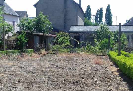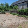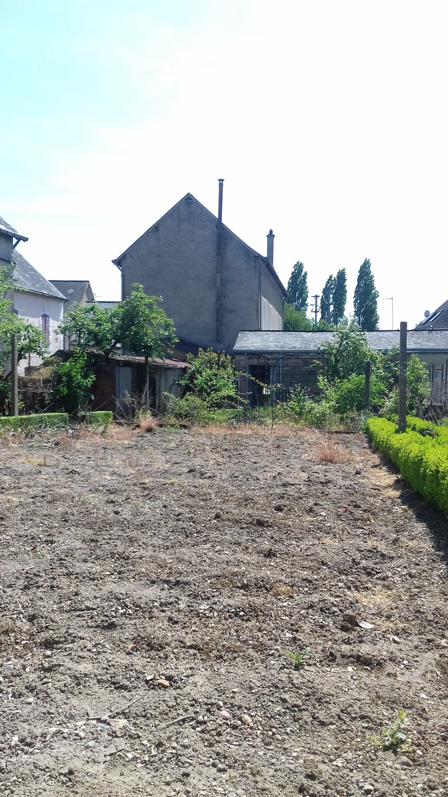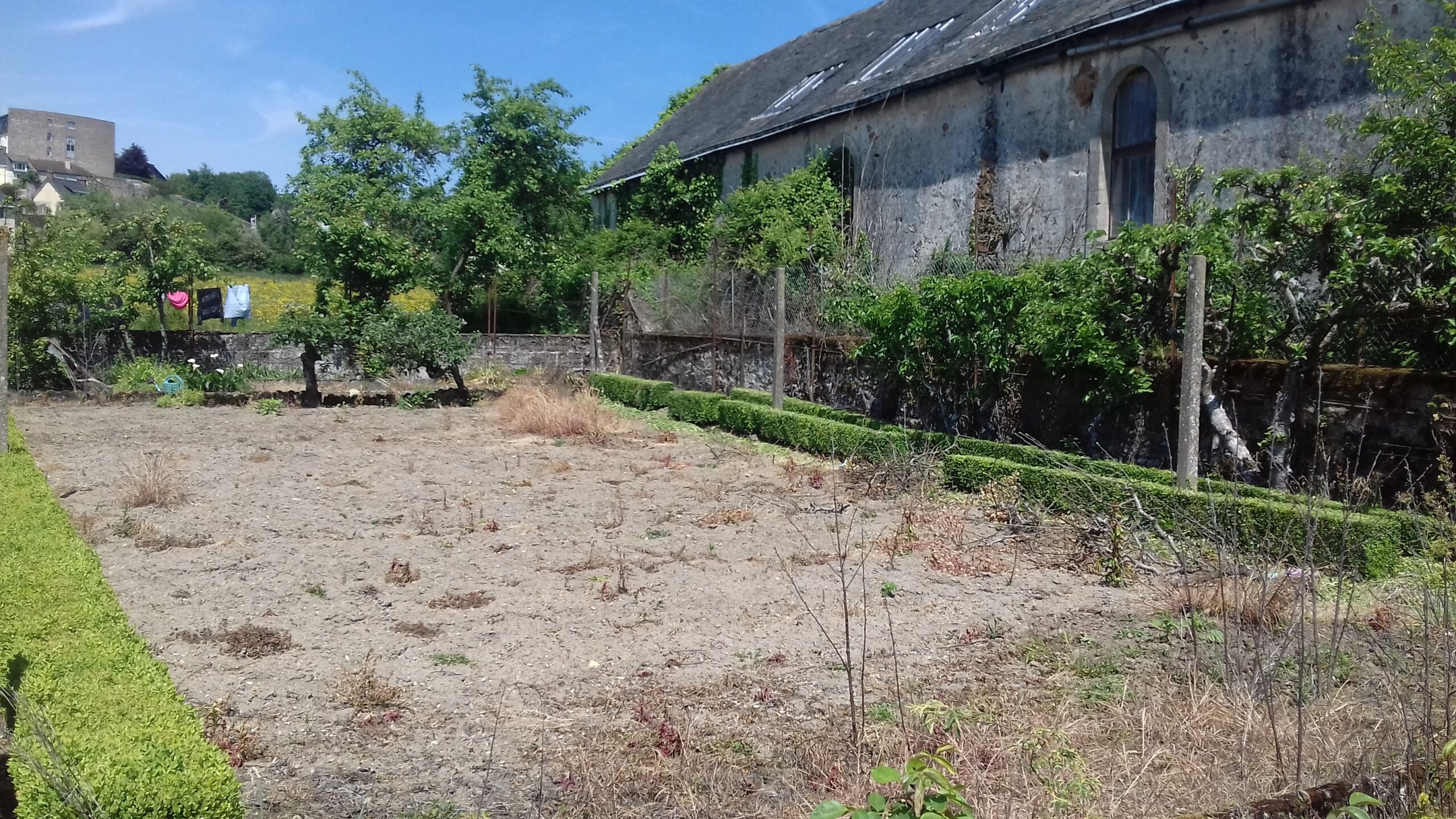 Jardin avec potager et arbres fruitiers à l’arrière.